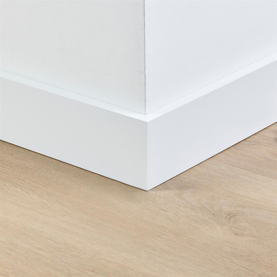 MDF plint 90x15x2400mm Recht RAL9016 Wit gelakt model "Amsterdam". Deze plint is kant en klaar en bij uitstek geschikt voor bij laminaat en PVC vloeren.