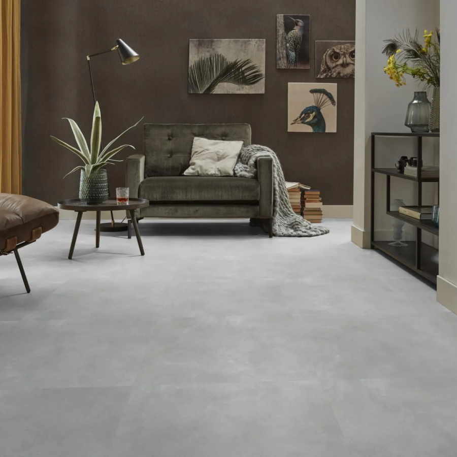 De Ambiant Piazzo Light Grey XL is een robuuste verlijmbare PVC tegel van 914 x 914 x 2,5 mm. Met zijn stijlvolle betonlook brengt deze tegel een moderne, industriële sfeer in elke ruimte. De sterke 0,55 mm slijtlaag maakt de vloer geschikt voor intensief gebruik, zowel in woningen als in projectruimtes.
