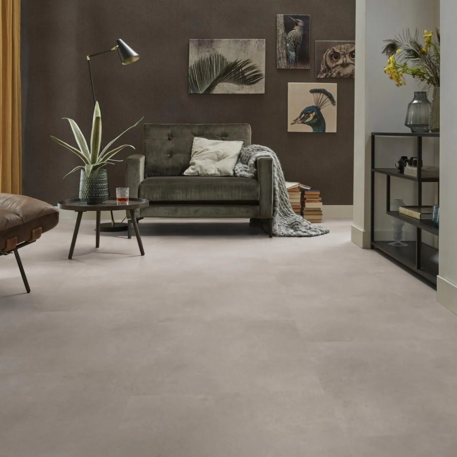 De Ambiant Sarino XL Light Grey is een robuuste verlijmbare PVC tegel van 914 x 914 x 2,5 mm. Met zijn stijlvolle betonlook brengt deze tegel een moderne, industriële sfeer in elke ruimte. De sterke 0,55 mm slijtlaag maakt de vloer geschikt voor intensief gebruik, zowel in woningen als in projectruimtes.