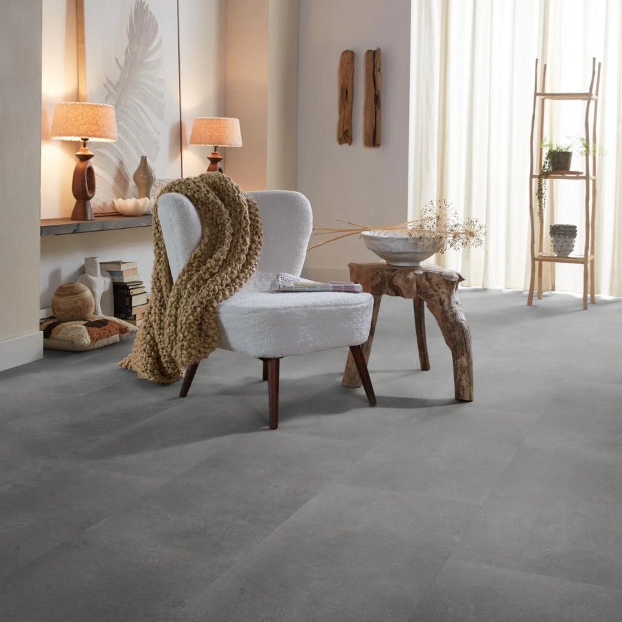 De Ambiant Sarino Dark Grey is een robuuste verlijmbare PVC tegel van 914 x 457 x 2,5 mm. Met zijn stijlvolle betonlook brengt deze tegel een moderne, industriële sfeer in elke ruimte. De sterke 0,55 mm slijtlaag maakt de vloer geschikt voor intensief gebruik, zowel in woningen als in projectruimtes.