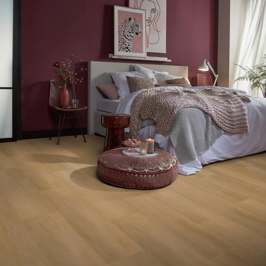 Ambiant Sentima PVC is een nieuwe collectie van Ambiant die perfect is voor de slaapkamer en zolder. De Ambiant Sentima vloer heeft een slijtlaag van 0,3mm en de stroken hebben een register embossed structuur. De stroken zijn 121,9 lang x 22,86 breed met v-groef. Dit betekend dat de structuur van de vloer exact het decor volgt, waarbij je dus de noesten niet alleen kunt zien maar ook voelen! Ambiant Sentima is leverbaar in 4 kleuren: Natural Oak, Dark Oak, Smoky en Beige.