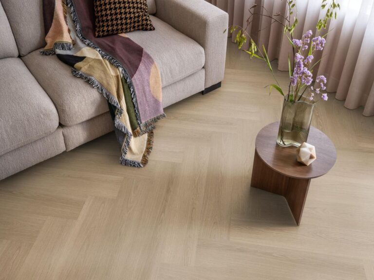 De Warm Oak kleur werkt bijzonder goed met lichte wanden, natuurlijke materialen en zwarte of bronzen accenten. In een open leefruimte geeft het XL-visgraat ritme zonder te druk te worden, terwijl in een smaller gangpad de grotere delen juist voor een ruimtelijk effect zorgen. De vloer komt uitstekend tot zijn recht in de woonkamer en eetkamer, maar is door de sterke, waterbestendige toplaag ook een logische keuze voor keuken en hal. In slaapkamers draagt de demping van het EVC-materiaal bij aan een rustige, comfortabele sfeer.