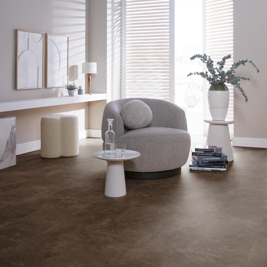 Ambiant Viretto Brown 8560.2023.19 PVC tegels zijn 1000 x 250 x 2,5 mm met rondom een v-groef en hebben een matte uitstraling. Voorzien van een toplaag van 0,55 mm. De grote Ambiant Viretto Brown betonlook pvc tegels zorgen voor een rustige industriële look.