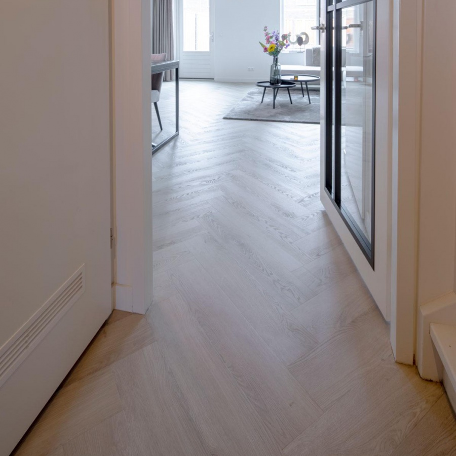 De Belakos Palazzo Visgraat XL strokenn hebben een slijtlaag van 0,55mm en een voelbare structuur die voorzien zijn van een 4-zijdige micro v-groef waardoor elk strookje afzonderlijk benadrukt wordt! Het is ook mogelijk om een visgraat vloer te voorzien van een 'band met bies' zodat het een traditionele parketvloer lijkt.