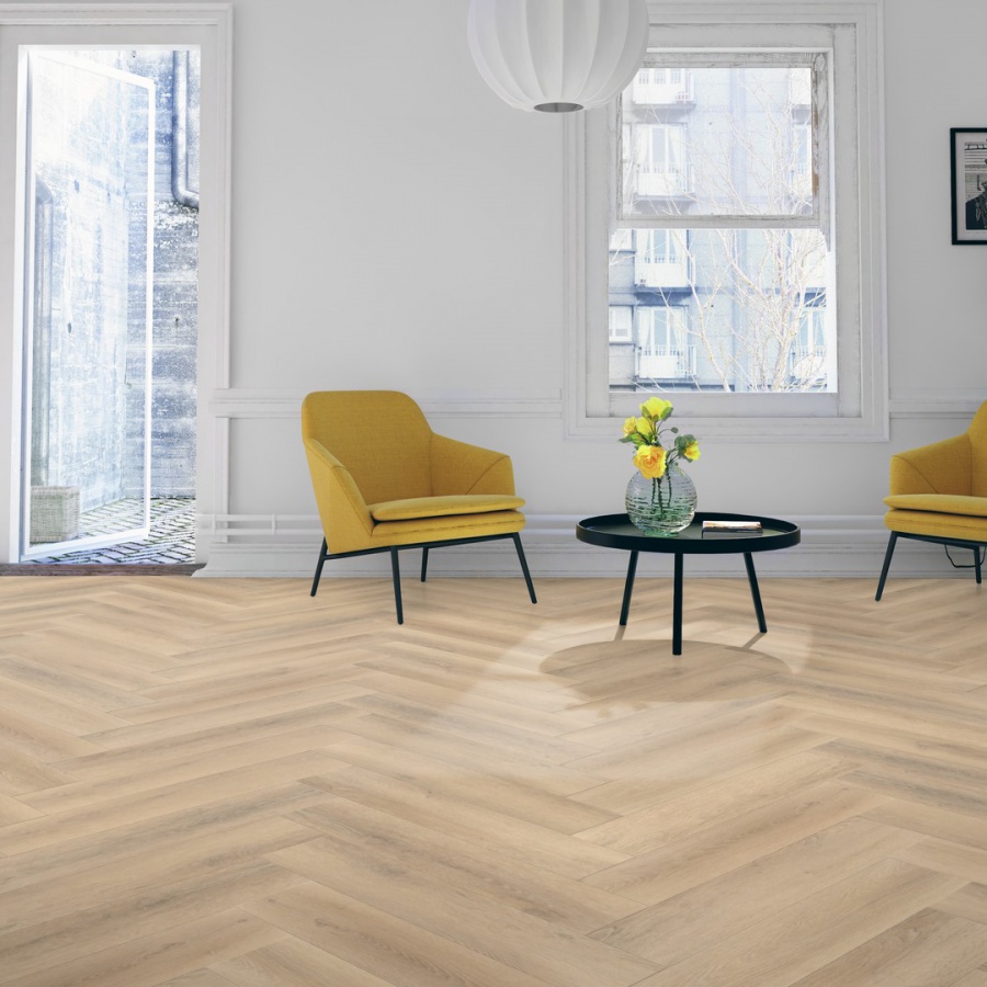 De Belakos Palazzo Visgraat XL 75 is een elegante plak PVC vloer met klassiek visgraatpatroon. De stroken van 77 x 15,3 cm hebben een natuurgetrouwe houtstructuur en subtiele micro v-groef, waardoor de vloer nauwelijks van echt hout te onderscheiden is. De 0,55 mm slijtlaag biedt uitstekende bescherming en maakt de vloer geschikt voor intensief gebruik.