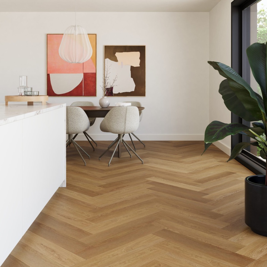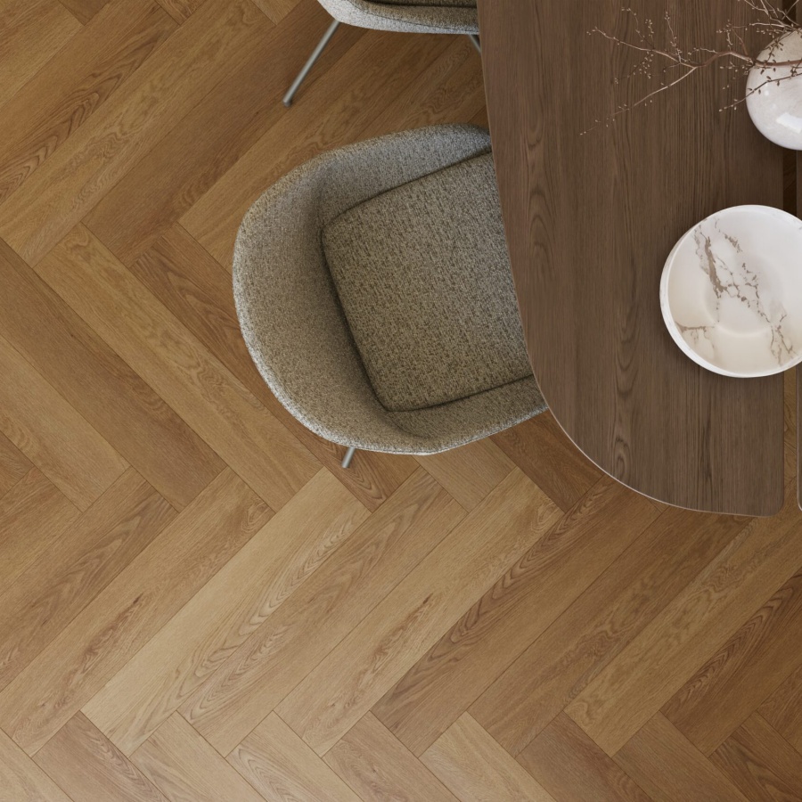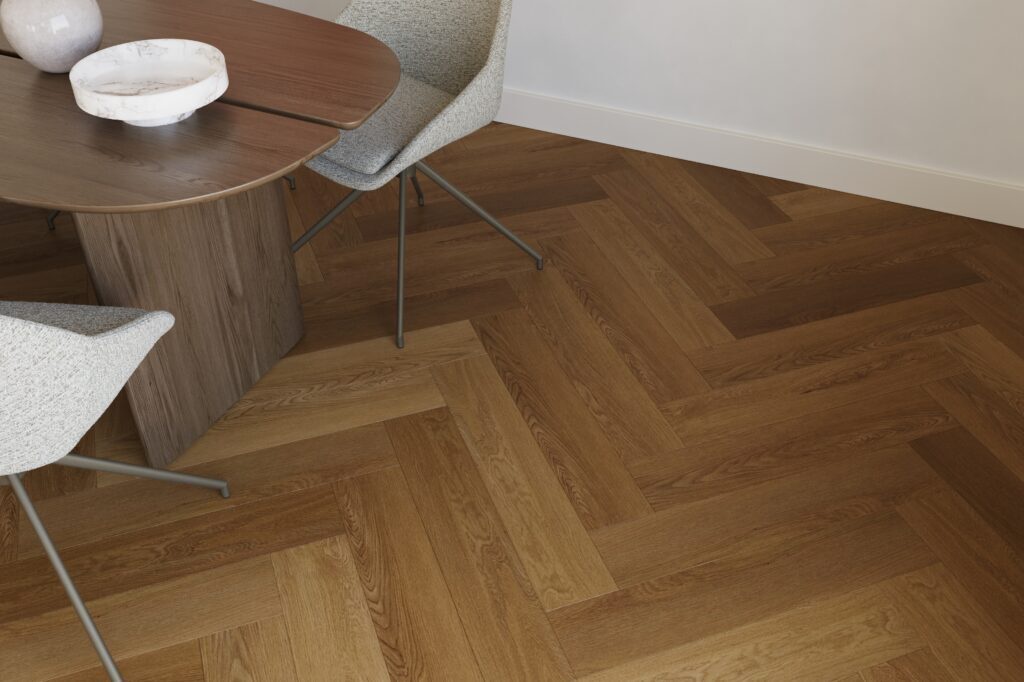 Castell 282 uit de Ultimate 880 collectie is een rustige visgraat vloer met in register geperst (EIR) (zichtbare en voelbare structuur) . De afmeting 76.2 x 15.24 cm is speciaal ontwikkeld om in visgraat- of blokpatroon motief te leggen.