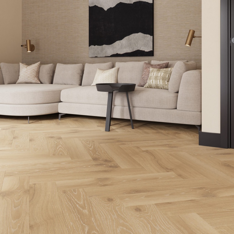 Castell Oak Cognac visgraat 293 uit de Ultimate 890 collectie is een visgraat vloer met een afmeting van 75 x 15 cm die speciaal is ontwikkeld om in visgraat- of blokpatroon motief te leggen.