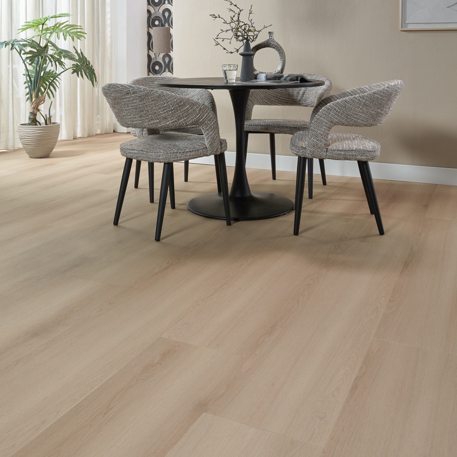 De Floer Landhuis PVC Lichtbruine Eik FLR-3236 is een robuuste MEGAMAT PVC vloer met een 0,55 mm slijtlaag en royale planken van 1540 x 310 mm. De subtiele v-groef en matte afwerking zorgen voor een rustige, natuurlijke uitstraling. Deze vloer is onderhoudsvriendelijk, waterbestendig en geschikt voor vloerverwarming en vloerkoeling.