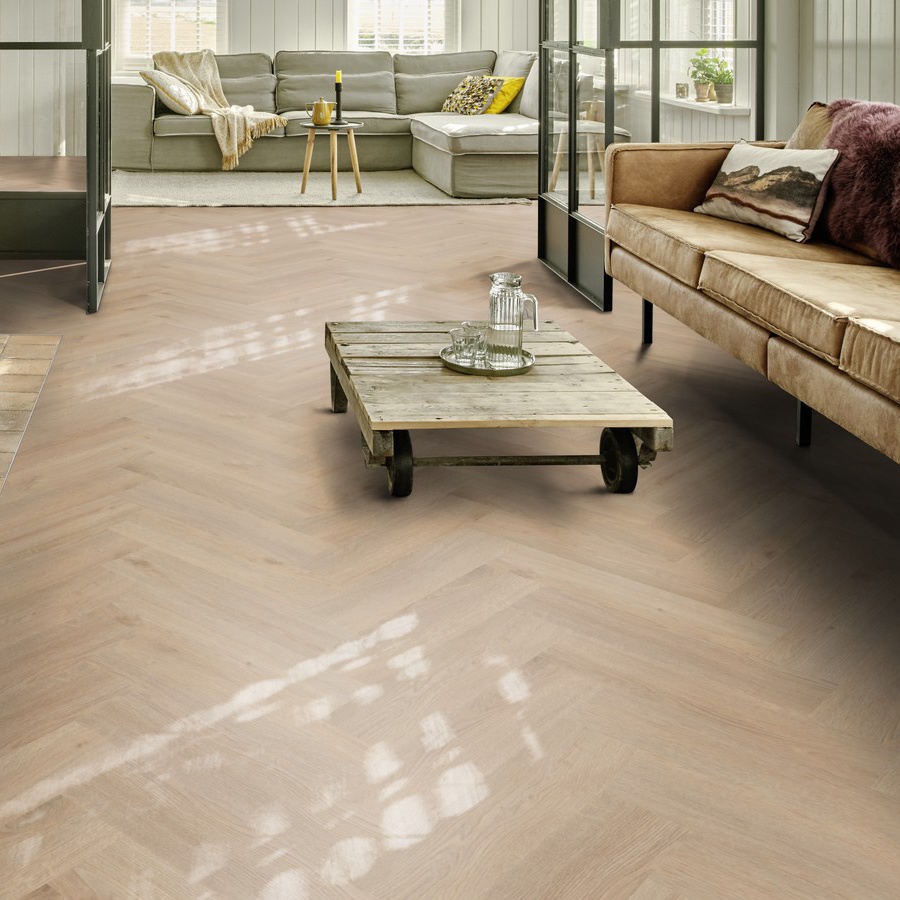 Moduleo Roots Visgraat Mexican Ash is een strak afgewerkte visgraat in plak pvc (dryback). Door de dunne opbouw is deze vloer ideaal voor renovatie en een stabiele, stille basis.