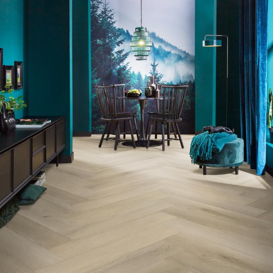 De geïntegreerde 10dB-geluidsdempende onderlaag zorgt bovendien voor een aanzienlijke verhoging van het wooncomfort, waardoor de vloer niet alleen esthetisch aantrekkelijk is, maar ook functioneel. De extra brede en lange visgraatplanken, ook wel Walvisgraat genoemd, geven een modern accent aan het traditionele visgraatdesign. Deze planken zorgen voor een luxe, tijdloze uitstraling in elke ruimte.