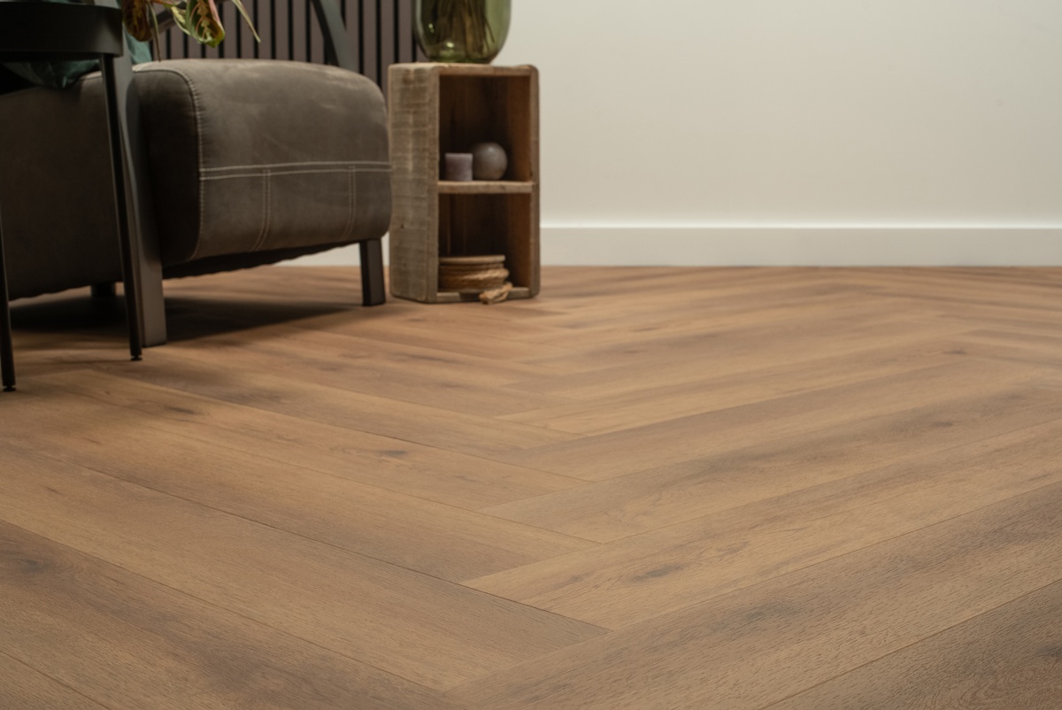 Floer FLR-3912 Walvisgraat click PVC Narwal Nootbruin PVC vloeren hebben een matte uitstraling.