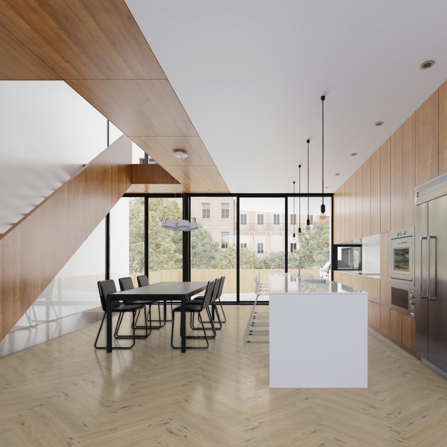Therdex 7561 uit de Herringbone Authentic collectie is een rustige visgraat vloer met in register geperst (EIR) (zichtbare en voelbare structuur) . De afmeting 76.2 x 15.24 cm is speciaal ontwikkeld om in visgraat- of blokpatroon motief te leggen.